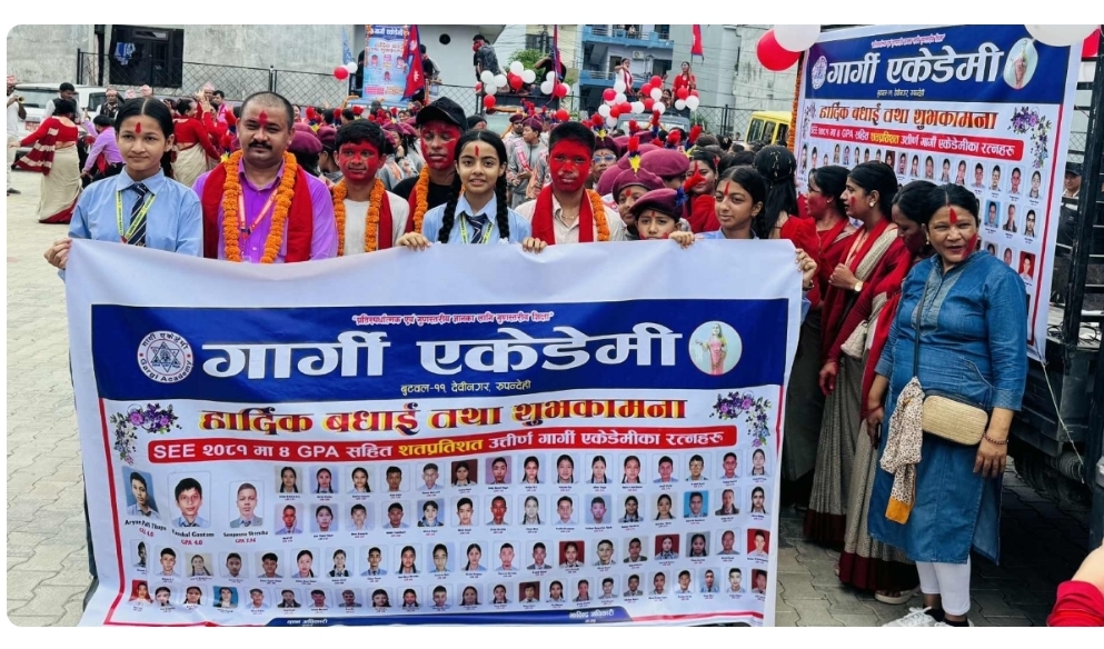 बुटवल । बुटवल-११ देवीनगरस्थित गार्गी एकेडेमीले माध्यमिक शिक्षा परीक्षा (एसईई)मा ४ जीपीएसहित उत्कृष्ट नतिजा ल्याएका विद्यार्थीलाईसम्मान गर्दै नगर परिक्रमा गराएको छ । मंगलबार बिहान विद्यालयबाट निस्किएको बाजागाजासहितको र्याली देवीनगर चौपारी, माझगाउँ, हात्तीसुढ, बुद्धनगर, मजुवा, जीतगढी, बेलबास, नयाँगाउँ, मगरघाट, रानीगञ्ज, सिमानगर, देवसिद्धचोक हुँदै विद्यालयमा आएको थियो ।