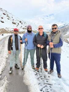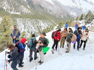 हिउमा चिप्लिएर यात्रीहरु लड्थे । कोही आफै उठ्थे । कसैलाई उठाउँथ्यौ । एकपटक अली ओरालो ठाउँमा प्रकाश दाइ र म अगाडि पछाडि थियौं । हामी चिप्लिदै झरिरहेका थियौं । एक्कासी एकजना पुरुषले मलाई समाउनुभयो, महिलाले प्रकाश दाइलाई । दुवै श्रीमान् श्रीमती हुनुहँुदो रहेछ । हामीलाई तल झारिदिनुहोस् भन्नु भो । बल्लबल्ल समालिएर तल झार्यौं । उहाँहरुको लठ्ठी पनि भाँचिएको र जुत्ता चिप्लिने खालको रहेछ । तल झरेपछि तपाईहरु जानुहोस्, हामी आउँछौ भन्नुभो ।