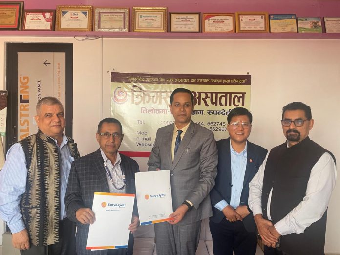 सम्झौतापत्रमा सुर्यज्योति लाईफ इन्स्योरेन्सका लुम्बिनी प्रदेश प्रमुख प्रेमप्रसाद अर्याल र अस्पताल निर्देशक डा.शेखरप्रसाद पोखरेलले हस्ताक्षर गर्नुभएको छ ।