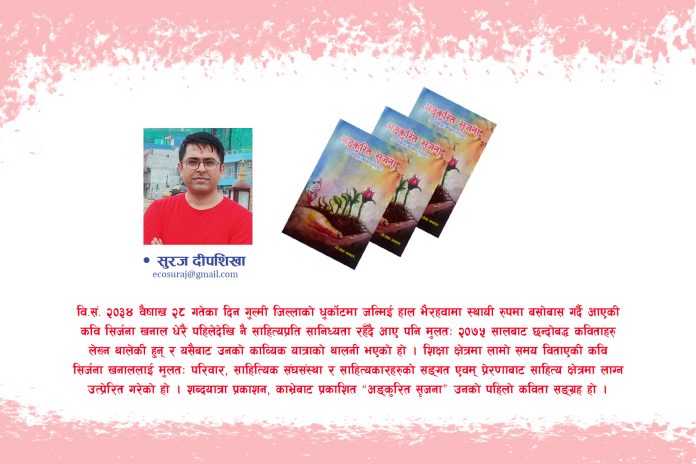 वि.सं. २०७५ सालदेखि लेखिएका कविताहरुको संगालो अङ्कुरित सृजना कविता सङ्ग्रहबाट औपचारिक रुपमा आफूलाई कविका रुपमा दर्ज गराएकी सृजना खनालले आफ्ना कविताहरुबाट साहित्य, सम्बन्ध, परिवा, समाज, देश, काल र परिस्थिति एवम् प्रकृतिसँग सम्बन्धित रहेर छन्दोबद्ध कविताहरु पस्केकी छन् । कविताहरुको सङ्ख्या धेरै छ । धेरैजसो कविताहरुमा कवि ईश्वरप्रति आस्तिक देखिन्छिन् । कविताहरुमा परिस्कारवादको चेतना देख्न सकिन्छ भने कतिपय कविताहरुका विषयवस्तुहरुमा समानता पनि भेटिन्छ । अधिकांश कविताहरुमा अविधा शव्दशक्तिको प्रयोग भएका छन् । सरल भाषशैलीको प्रयोगले अङ्कुरित सृजना कविता सङ्ग्रह आम पाठक वर्गका लागि पठनयोग्य बनेको छ । छन्दको यथोचित एवम् न्यायोचित प्रयोग र उत्कृष्ट काव्यिक धारले कविताहरुलाई सुन्दर बनाएका छन् । साधनाबाट नै कविमा परिपक्कताको विकास हुने भएकाले आगामि दिनहरुमा विषयगत चयन, भावको गाम्भिर्यता र प्रगतिशील चेतको सन्दर्भमा कवि सृजनाबाट थप अपेक्षा गर्न सकिन्छ । ecosuraj@gmail.com