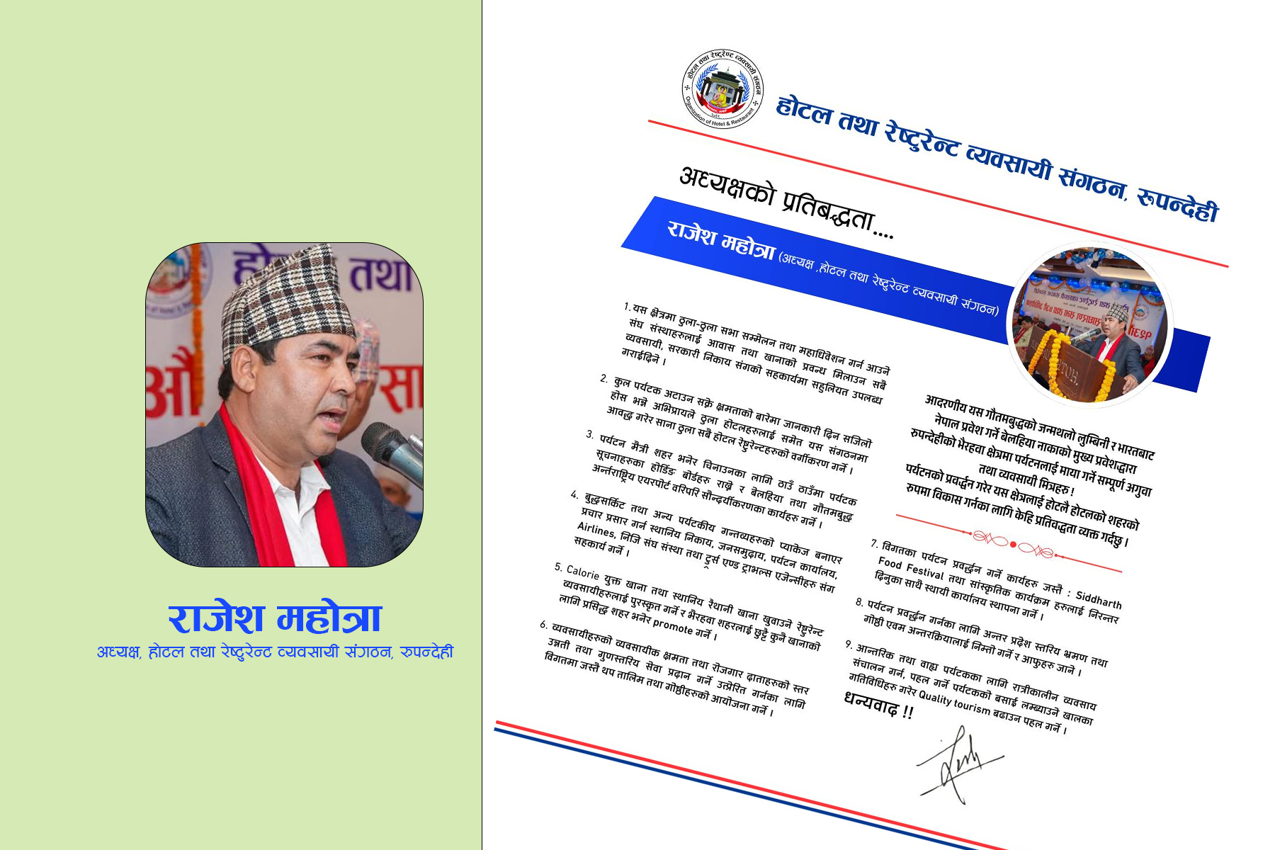 भैरहवा । होटल तथा रेष्टुरेन्ट व्यवसायी संगठन, रुपन्देहीका अध्यक्ष राजेश महोत्राले पर्यटन प्रवर्द्धन, व्यवसायी सशक्तीकरण तथा रुपन्देहीलाई होटलै–होटलको शहरका रूपमा विकास गर्ने लक्ष्यसहित आफ्नो कार्यकालका प्रतिबद्धता सार्वजनिक गरेका छन् । महोत्रा, होटल तथा रेष्टुरेण्ट व्यवसायी संगठन रुपन्देहीको यही पुस ५ गते सम्पन्न १२ औ बार्षिक साधारणसभा तथा सातौ अधिवेसनबाट अध्यक्षमा निर्वाचित भएका हुन् ।