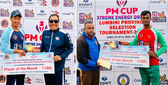 भैरहवा, माघ २० । बाँके र दाङले रुपन्देहीमा जारी प्रधानमन्त्री कप एक्स्ट्रिम इनर्जी ड्रिंक लुम्बिनी प्रदेशस्तरीय पुरुष एक दिवसीय क्रिकेट छनोट प्रतियोगिता जित निकालेका छन् । लुम्बिनी प्रदेश क्रिकेट संघको आयोजनामा जारी प्रतियोगितामा भैरहवास्थित सिद्धार्थ क्रिकेट मैदानमा भएको खेलमा बाँकेले पाल्पालाई ५ विकेट र दाङले कपिलवस्तुलाई २ विकेटले पराजित गर्दै जित निकालेका हुन् ।