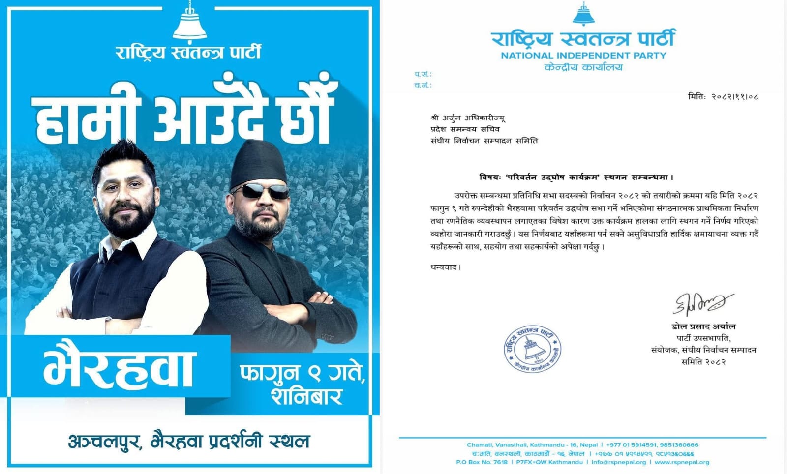 भैरहवा, ८ फागुन । राष्ट्रिय स्वतन्त्र पार्टी (रास्वपा) का सभापति रवि लामिछाने र वरिष्ठ नेता बालेन्द्र शाह (बालेन) को उपस्थितिमा फागुन ९ गते शनिबार अञ्चलपुरस्थित भैरहवा प्रदर्शनीस्थलमा आयोजना हुने तय गरिएको आमसभा परिवर्तन उद्घोष सभा) स्थगित भएको छ।