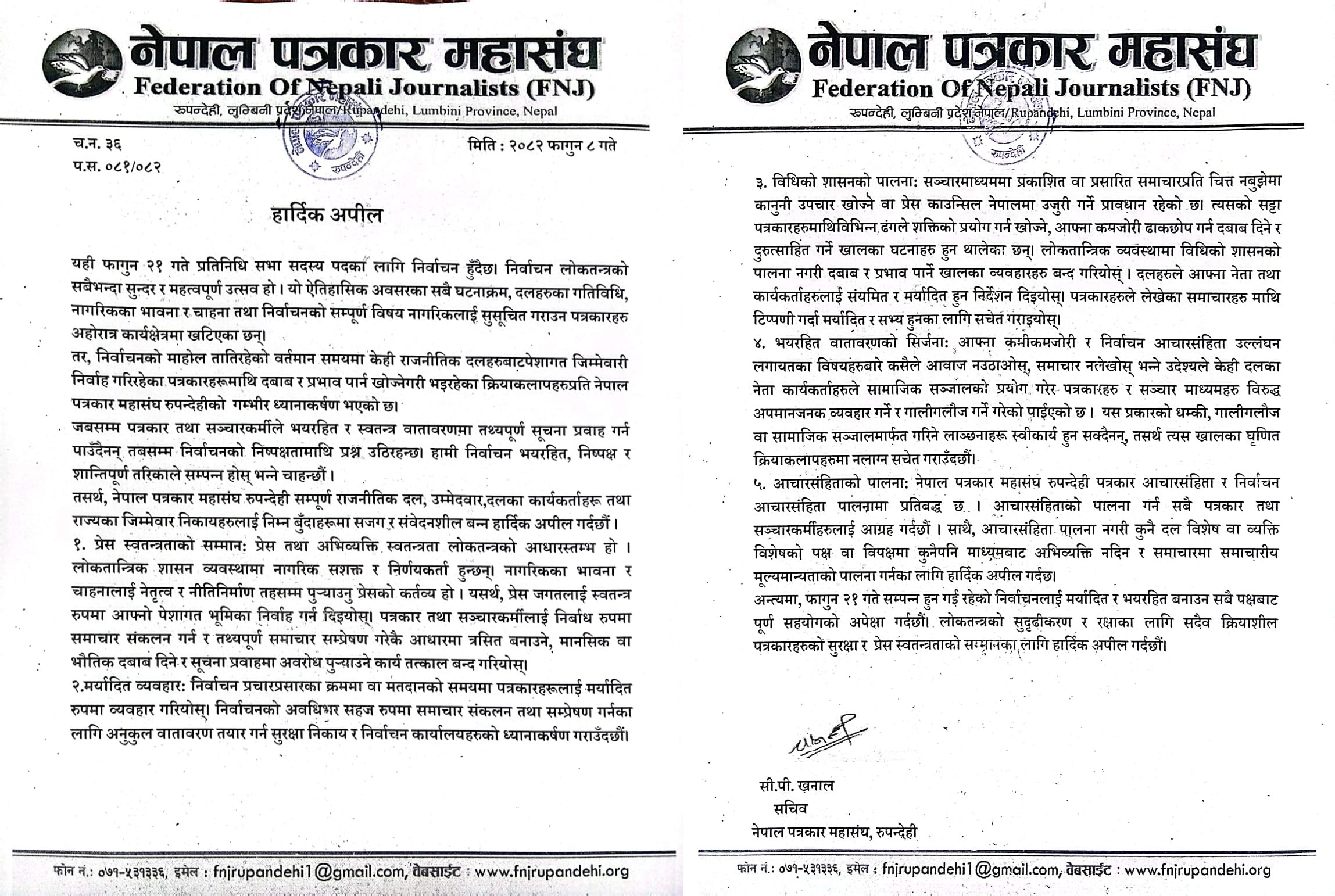 महासंघका सचिव सी.पी. खनालद्वारा जारी विज्ञप्तिमा निर्वाचन लोकतन्त्रको महत्वपूर्ण उत्सव भएको उल्लेख गर्दै निर्वाचन अवधिभर पत्रकार र सञ्चारमाध्यममाथि कुनै प्रकारको दबाब, प्रभाव वा अवरोध सिर्जना नगर्न आग्रह गरिएको छ ।