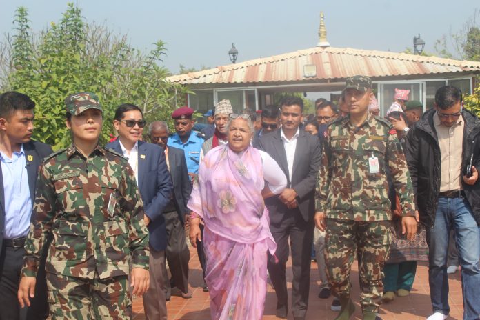 भैरहवा । आसन्न निर्वाचन केन्द्रीत बिषयमा सुरक्षा निकायसँगको छलफल पछि नेपाली सेनाको हेलिकोप्टरबाट बुद्ध जन्मस्थल लुम्बिनी पुगेकी प्रधानमन्त्री शुशिला कार्कीले लुम्बिनीस्थित ऐतिहासिक तथा पुरातात्विक सम्पदाहरुको अवलोकन गर्नुभएको छ ।