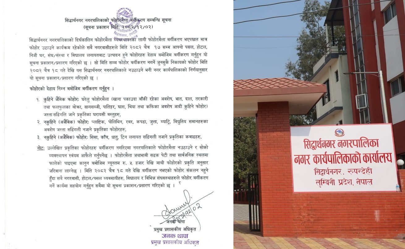 भैरहवा । सिद्धार्थनगर नगरपालिकाले फोहोरमैला व्यवस्थापनलाई प्रभावकारी बनाउन फोहोर वर्गीकरण अनिवार्य गरेको छ। नगरपालिकाले सार्वजनिक सूचना जारी गर्दै नगर क्षेत्रभित्रका घर, होटल, पसल, संघ–संस्था तथा विद्यालयबाट निस्कने फोहोरलाई तोकिएको मापदण्डअनुसार छुट्याएर मात्रै संकलन गरिने जनाएको छ।