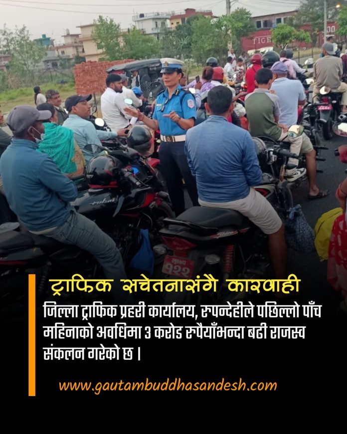 भैरहवा । जिल्ला ट्राफिक प्रहरी कार्यालय, रुपन्देहीले पछिल्लो पाँच महिनाको अवधिमा ३ करोड रुपैयाँभन्दा बढी राजस्व संकलन गरेको छ । कार्यालयका अनुसार चालु आर्थिक वर्ष २०८२/०८३ अन्तर्गत मंसिर १ गतेदेखि चैत मसान्तसम्ममा ३ करोड १० लाख २८ हजार रुपैयाँ राजस्व उठाइएको हो ।